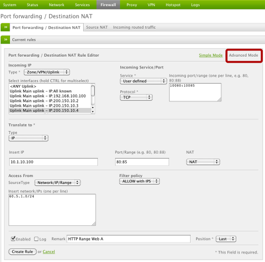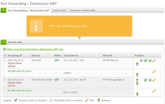 In this simple example, we'll setup a DNAT (Port Forward) for a range of ports for a web server in the Orange (DMZ) network. We'll use one of our statically assigned public IP addresses as our external entry point for this exposed service.