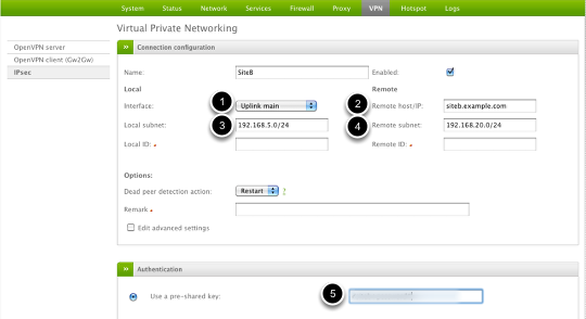 On the Endian (Site B) device under VPN > IPSec and the "Connection status and control" box, click the Add button to create a new connection.