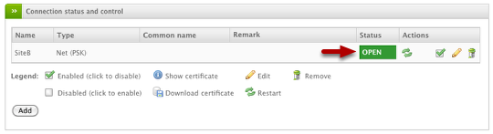On the Site A VPN device, you should the "Status" go from CLOSED to OPEN which indicates a successful connection.