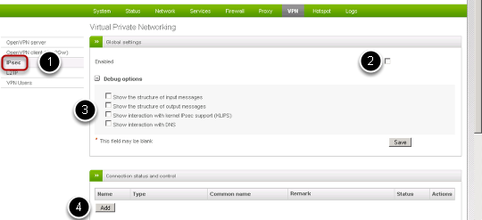 1. Click on to the IPsec sub-menu item to open the page to configure IPsec, which consists of three boxes.