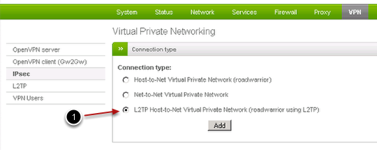 In the first panel, choose the type of connection to be used, which is in this case the third option (1), i.e., a "roadwarrior using L2TP", then click on Add.