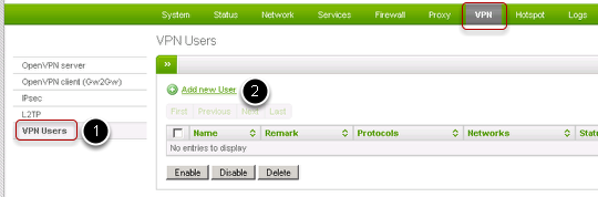 To create new L2TP users, go under Menubar ‣ VPN ‣ VPN Users (1), then click on Add new User (2).