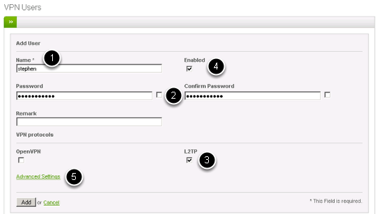 In this step you define the name (1) and the password (2) for the VPN user. Make also sure that you check the L2TP (3) and Enabled (4) checkboxes to activate a new L2TP user. Finally, click on Advanced Settings to proceed to the last step.