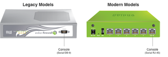Connect one end of the console cable to the Endian device and the other end to your computer serial or USB port if you're using the adapter. Note that the connection type has changed from the older (legacy) Endian hardware units to the newer (modern) models which now use an RJ-45 type connector (and not the DB-9 serial).