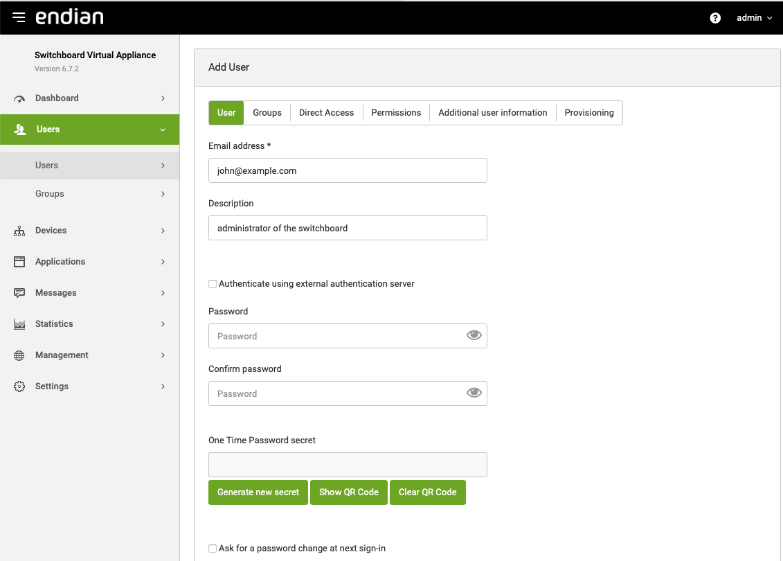 - In the User tab you can create new users, by filling in at least the username (which is the user's email address, that must be a valid one) and a password.