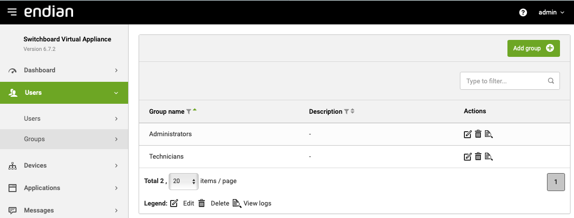 - In the Groups tab click on Add group to define a new group. Provide the group name (Administrators and Technicians in our scenario), which must be unique, and a description. You will be able to add users to the group once you have created them.