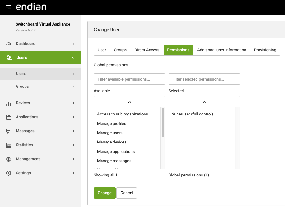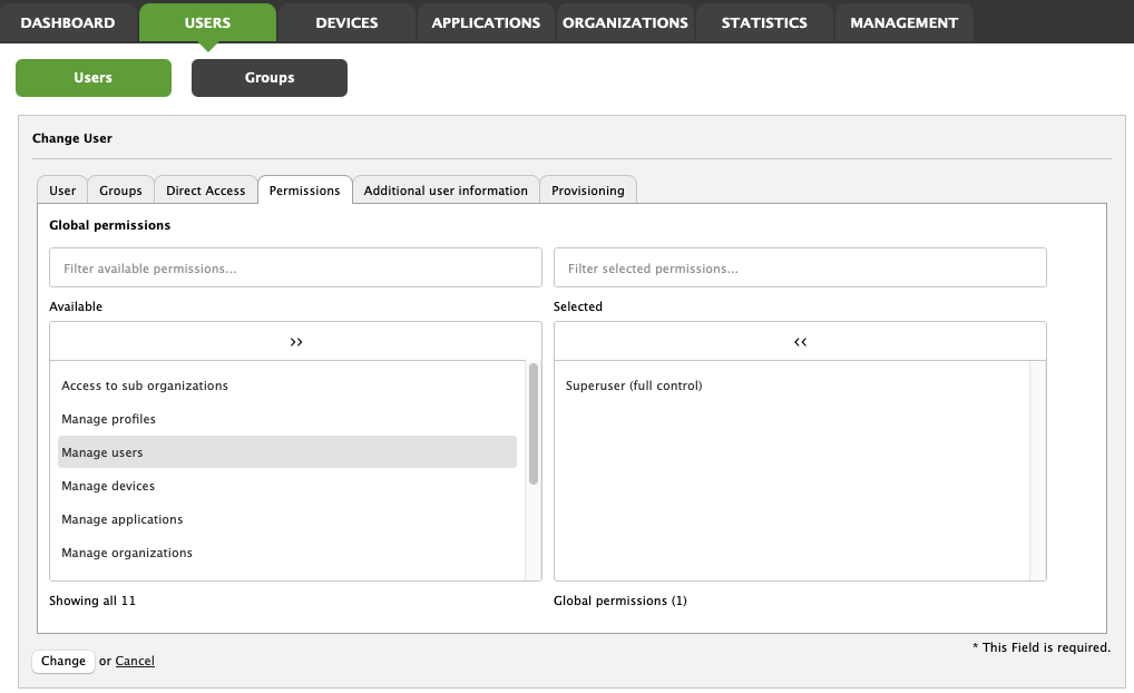 - Next in the Permissions tab, you can assign this use the appropriate permission. In this case, the user is an administrator and is assigned the superuser permission. The definitions of the permissions are listed below.