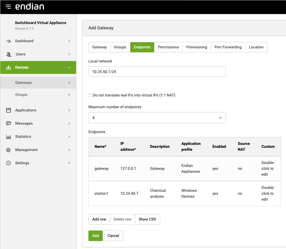 - Go to the Endpoints tab, in which you can define the Endpoints that are placed behind the Gateway. Endpoints are those devices that you need to reach through the VPN tunnel established by the gateway. Here you need to click on the Add row button to add a new endpoint. In our example, the endpoint is called Station1, is used to store results of chemical analysis, has IP Address 10.25.40.7 and uses the Windows devices application profiles (more on this later).