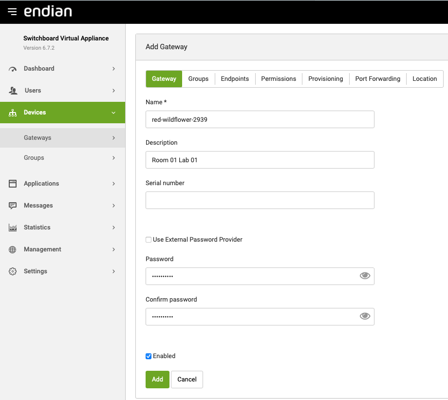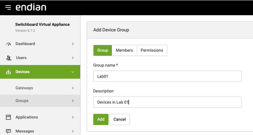 - In the Groups tab, define a new group name for gateways and add a description. In our example we set up a group called Lab01, that will encompass all gateways serving that lab. Click on Add to save the settings and create the new group.
