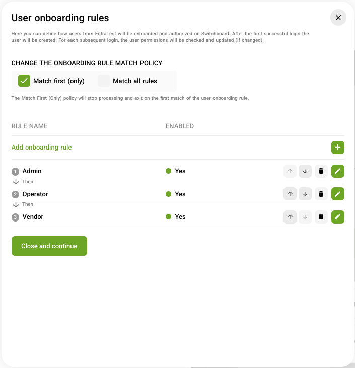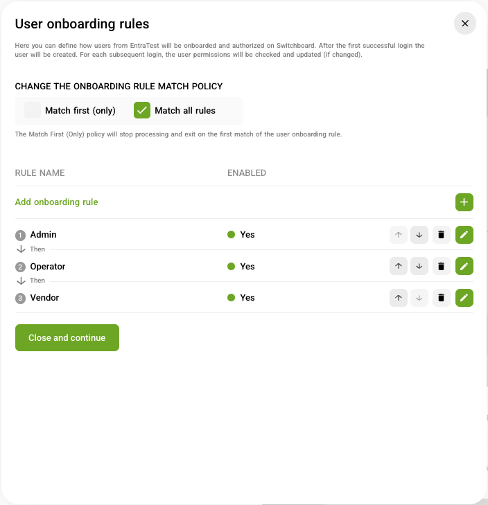 From here, you can add as many onboarding rules as you require in order to properly onboard all the various user and groups who will be accessing the Switchboard. For each onboarding rule you can also specify the order which factors into the processing of the onboarding rules.