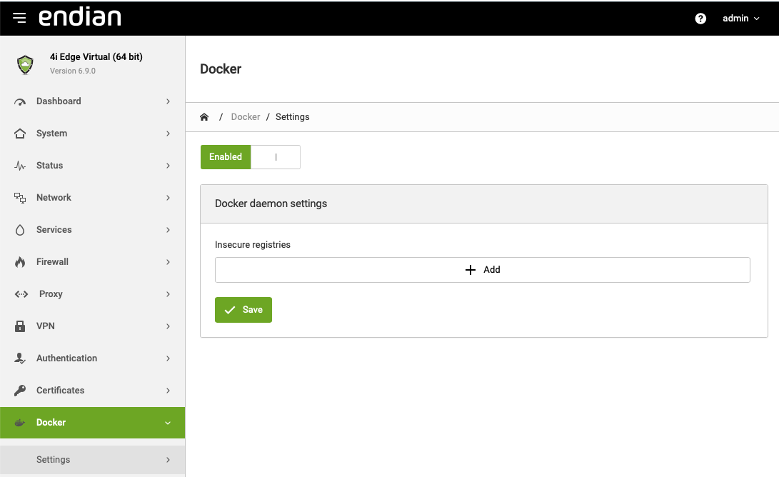 You can enable Docker on Endian by navigating to Docker > Settings page and click the Enable switch.