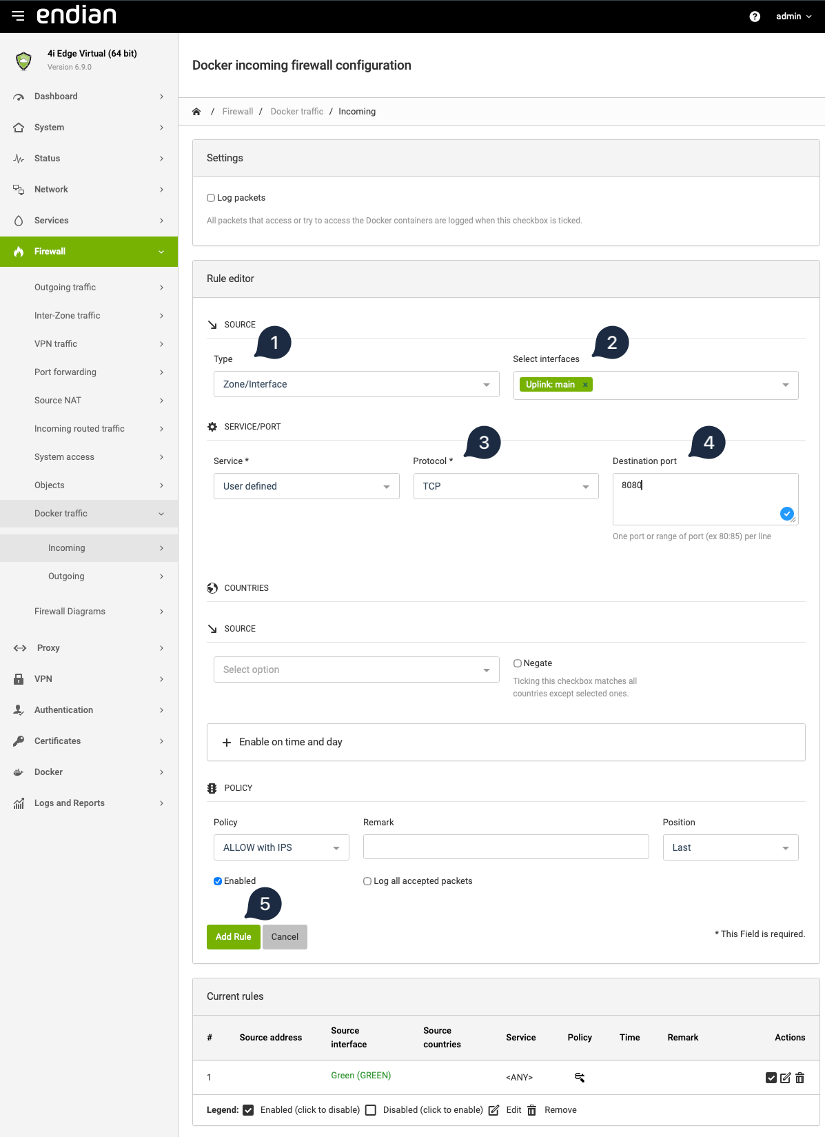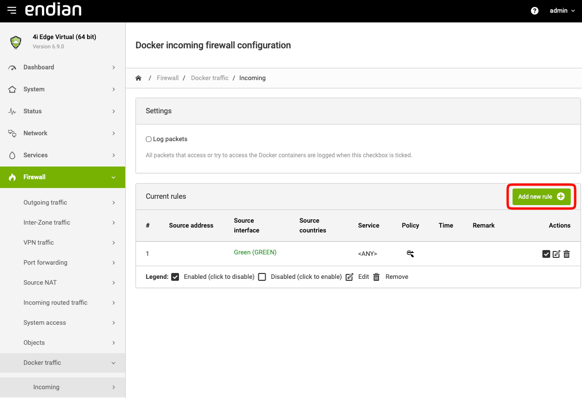 Navigate to Firewall > Docker Traffic > Incoming and click Add New Rule: