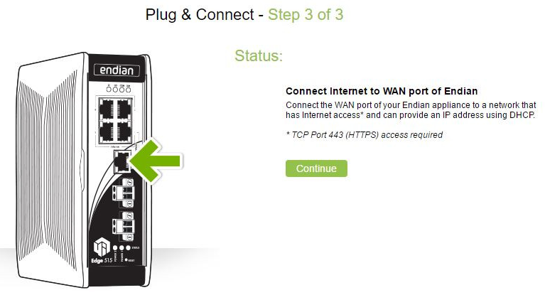 It is possible now to boot up the device and configure it. First, connect the WAN Ethernet cable to the appropriate port of your device, as shown in the next image, then click on the Continue button on the Switchboard's GUI.