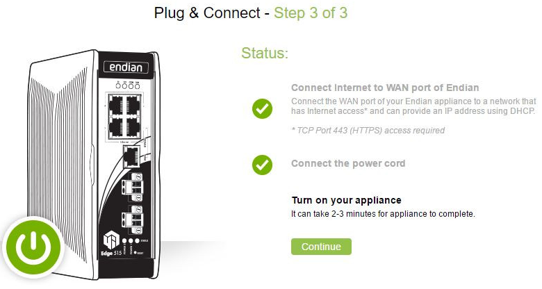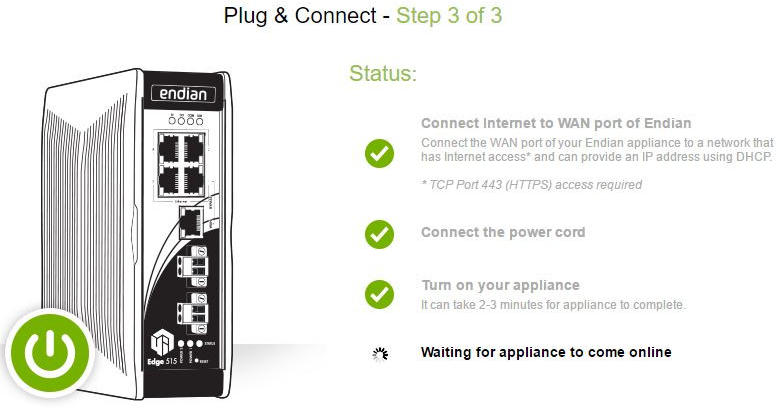 - can connect to the Internet and freely access the websites connect.endian.com and network.endian.com during the whole time required by the procedure,