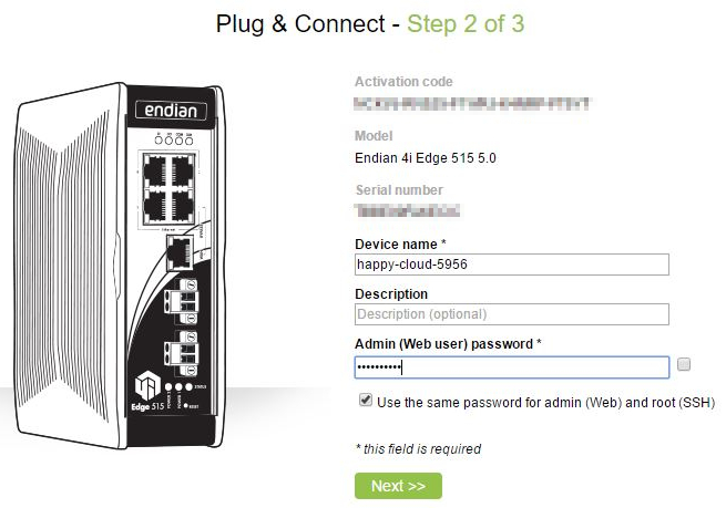 Once you have supplied all the required data, you can click on the Next >> Button to start the set up of the Endian device.