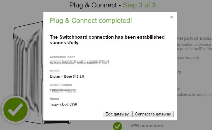 While the Switchboard tries to establish the connection, you will be able to follow the process: Indeed, the progress or any error messages are shown on the Switchboard's GUI. After a few minutes you will see an overlay like the following one. Click on either Edit gateway to configure the device or on Connect to gateway to use an application and directly connect to it.