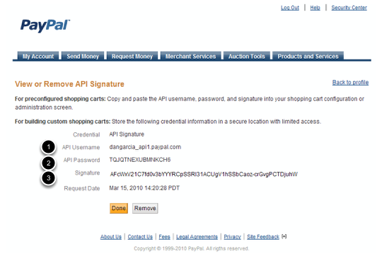 Once you've created an account and logged into the portal, you must request API credentials. Once logged in, click Profile under My Account, and select API Access, then Request API Credentials. Now check Request API Signature and then Agree and Submit and you should see a screen similar to above (this is just a demo screen).