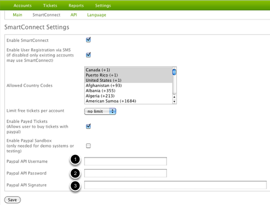 Now we can copy the API information from the previous step over to the Endian hotspot settings. Under Settings > SmartConnect, select Enable Paid Tickets and then you can fill in the the appropriate PayPal API fields.