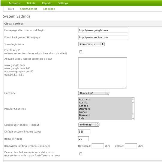This document will walk you through setting up the Endian hotspot to run with SmartConnect (self-service) so users can create their own accounts and access the Internet. This particular example will demonstrate the process using paid tickets with PayPal integration.