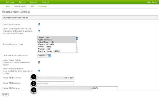 Now we can copy the API information from the previous step over to the Endian hotspot settings. Under Settings > SmartConnect, select Enable Paid Tickets and then select Enable PayPal Sandbox and now you can fill in the the appropriate API fields.