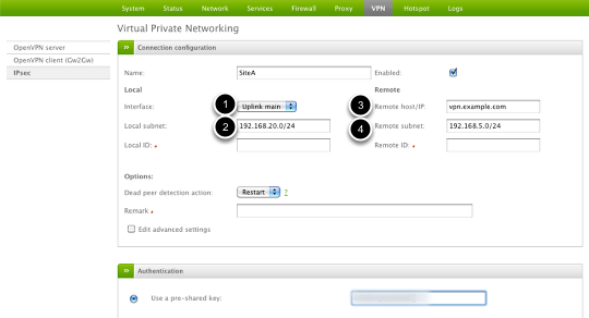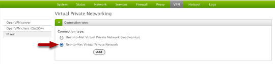 On the Endian (Site B) device under VPN > IPSec and the "Connection status and control" box, click the Add button to create a new connection.