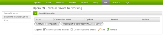 On the client device, from the Endian main menu select VPN > OpenVPN client (Gw2Gw). Once there you will click the Add tunnel configuration button to begin the creation of the client VPN account.