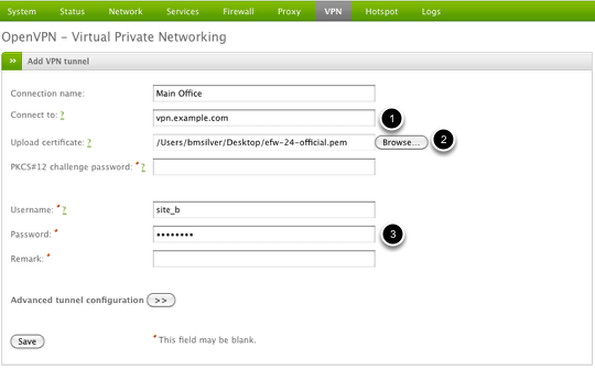 Now we can configure the setting for the VPN client device. The first field, Connection name, is just a generic string to describe this VPN connection. The next field, Connect to (1), is where you will provide the IP address or DNS hostname (vpn.example.com) of the Endian VPN server. Next you need to upload your server certificate (2) that you had downloaded from the VPN server in the first step. Last, you must provide the Username and Password (3) of this VPN account you previously configured.