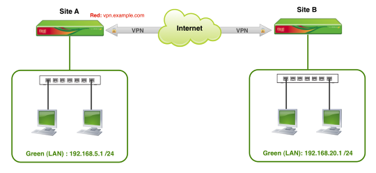 The diagram above is a simple illustration of the configuration example covered in this guide. We'll be creating a Net-to-Net connection to allow communication between the two internal Green (LAN) networks of each Endian device.