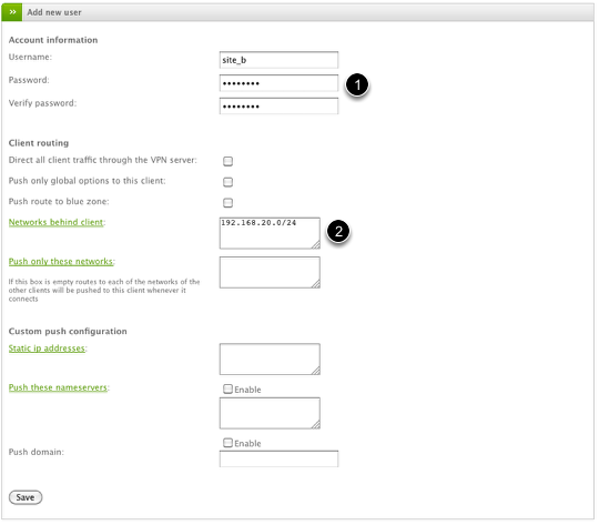 The main things to configure for the new Net-to-Net VPN account are the Username and Password (1) and the Networks behind client (2) which identifies the remote VPN network (Site B) that you will be connecting to this VPN server. This field (2) must be in the format of Network/CIDR (as illustrated) and can accept multiple entries one per line.