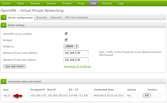 If all goes well, we should see the Site B remote device show up on Site A under the Connection status and control section of our VPN server. Once the user is connection you can view relevant VPN user information from this screen as well.