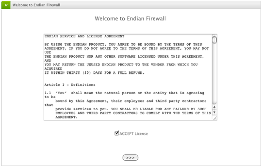 Next you must select that you accept the Endian license agreement. Click the Forward button to continue.