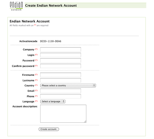Next complete the short form to finalize your account creation. Be sure you make a special note of your login and password as you'll need this to register all future Endian devices.